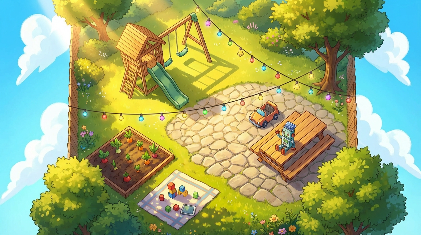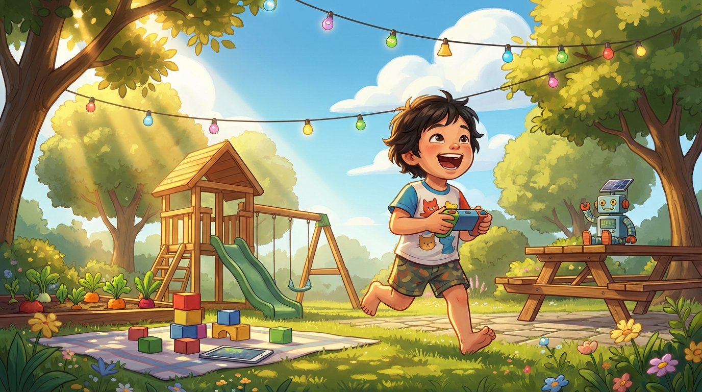 它一会儿往上飞,一会儿往下落,还能转圈呢!我看着无人机越飞越高,好像能摸到云朵,把院子、大树、小车都拍得清清楚楚。风轻轻吹过,它还是稳稳的,太厉害啦!